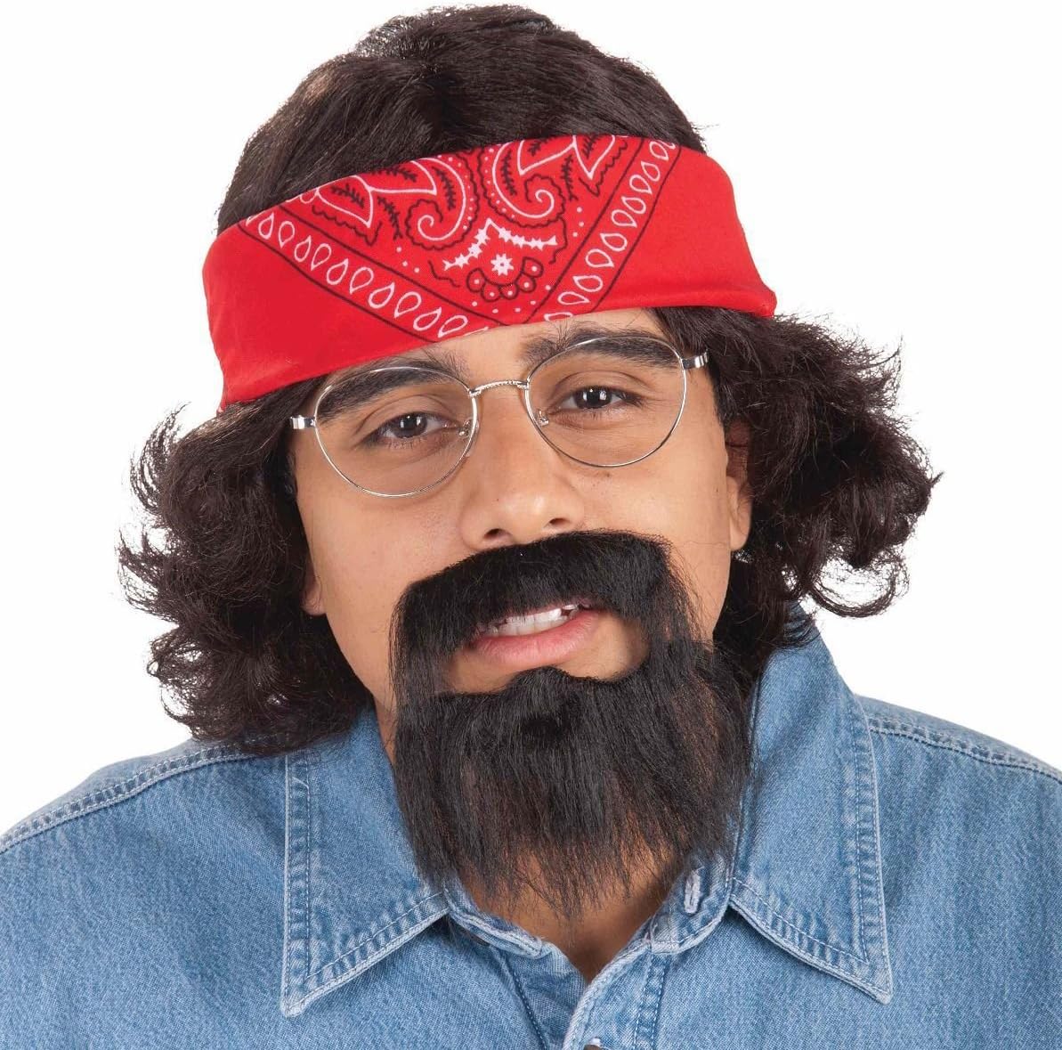 Chong costume is a long sleeved denim top and distressed jeans with brown shoes, eyeglasses and a red bandana.